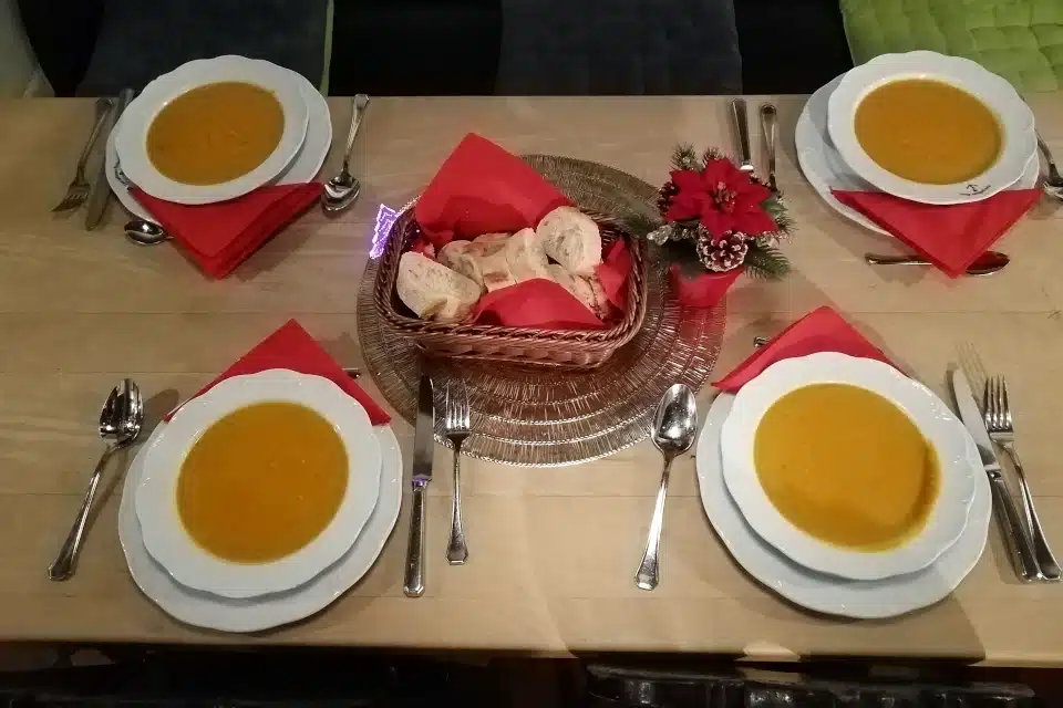 Bei entspannter rustikaler Hütten – Atmosphäre ein leckeres Essen zaubern. Gemeinsam werdet ihr das 4 – Gänge – Menü zubereiten und genießen. Freut euch auf Bruschetta, Suppe (der Saison), Hüttenkartoffeln & fränkische Würste mit Beilagensalat und Schichtdessert. Gute Laune und Spaß ist dabei garantiert.